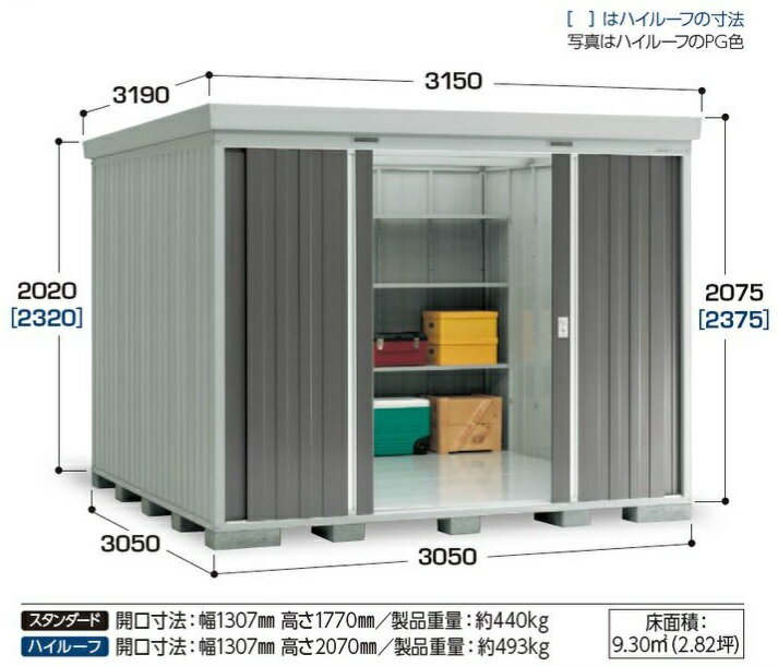 ・本体高さ:2375mm ・本体幅:3150mm ・本体奥行:3190mm ・製品重量:約493Kg ・床面積:9.30m2(2.82坪) ・棚板6枚付(20) ・基礎ブロック別途(25個)が必要です ※ブロックは付属しておりません イナバ物置のお届け範囲は、【関東・山梨(一部)】(離島は除く)となります 【オプションの取り扱いについて】 オプションの追加は、本体同時購入時のみ承ります。